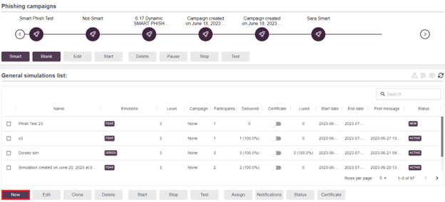 2. Click “New” to start the configuration process in the phishing Campaign view.