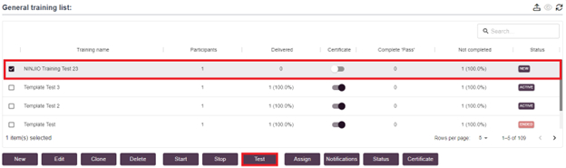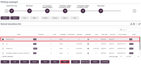 8. Once the Training Campaign has been configured, you will want to test it by selecting the campaign and hitting the “Test” button. (Note** You will see the status change from “New” to “Testing” when you do this action.)