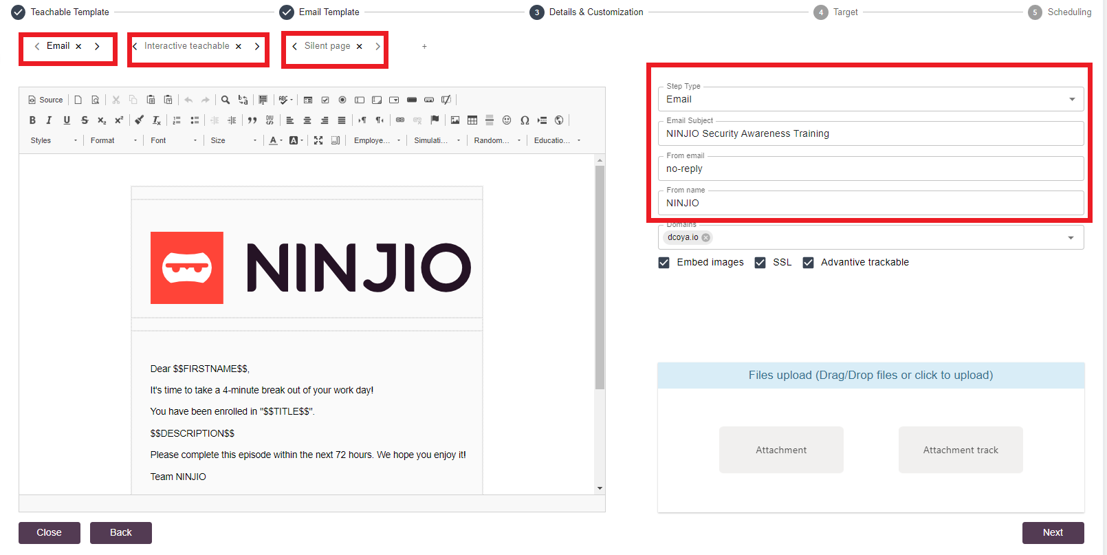 5. In the Details & Customization page, you can update information in the Email Subject line, From Email, and From Name. You also can edit the domains associated with the template and enable SSL, Embed images, and upload attachments files. If you need to make other modifications, such as to the Interactive teachable and the Silent page, click the tabs to view the menu options. Once all is confirmed, hit “Next”.