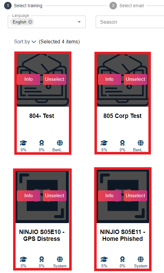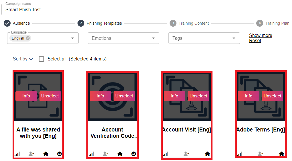 Smart PHISH3D Campaigns allow you to select multiple phishing templates simultaneously that can be launched and matched by level and emotions.