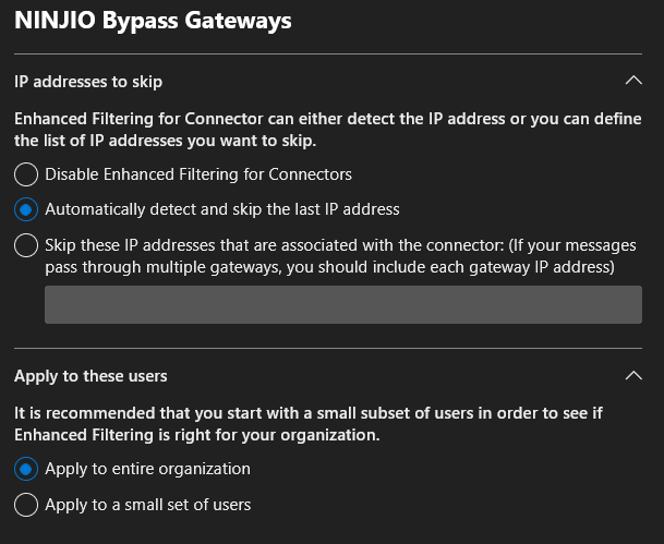10. Select your new connector and check "Automatically detect and skip the last IP address" and leave "Apply to entire organization".