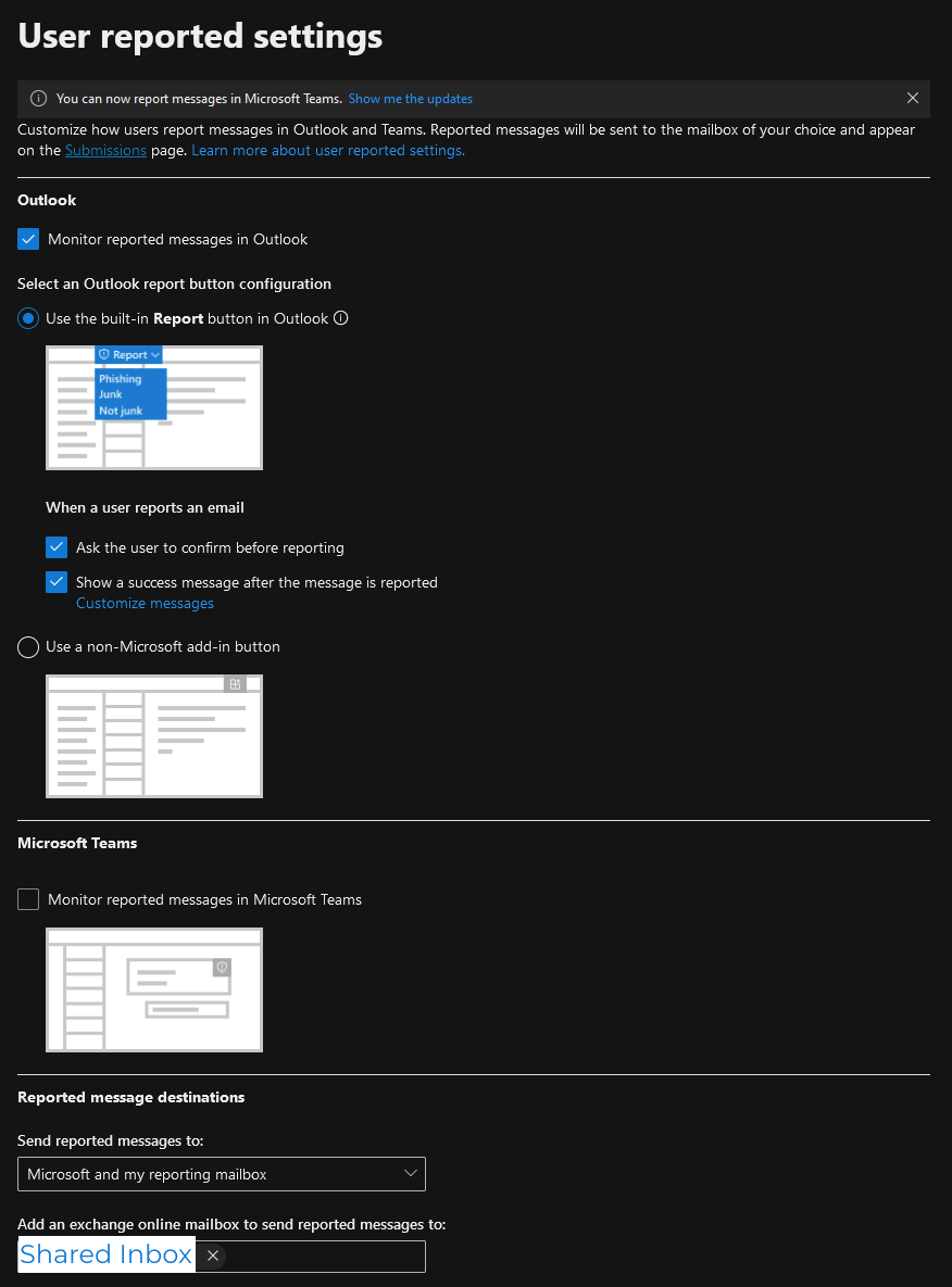 Please note: If email redirection is enabled, reported emails may not remain in the shared inbox.
