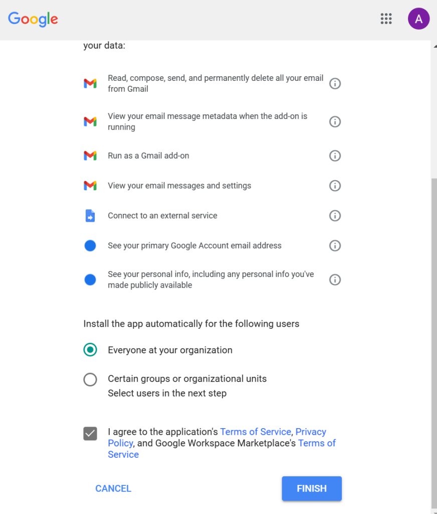 3. Choose the users/groups to receive the button, or select Everyone at your organization for all users. Accept the terms of service and click Finish.